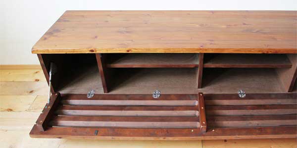 古材風に傷やシミを表現したエイジング加工を施されたTVボード。